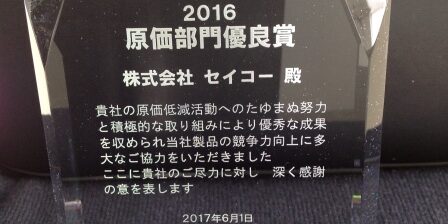 6月52017新着情報 原価低減の面を評価いただき、㈱ケーヒンバルブ様より表彰いただきました。 今後とも引き続き、お客様に貢献できるよう取り組んで参ります。 Post navigationPreviousPrevious post:新工場にて業務開始しましたNextNext post:夏季休業のお知らせ