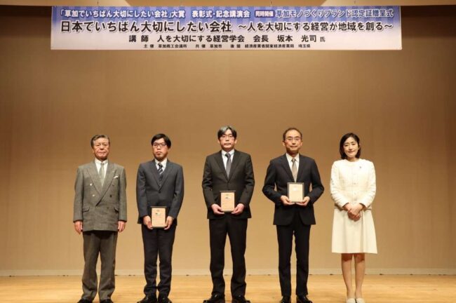 先日の草加モノづくりブランド認定証贈呈式の様子が草加市ホームページに掲載されました。 令和5年度 草加でいちばん大切にしたい会社大賞表彰式・記念講演会および草加モノづくりブランド認定証贈呈式が開催されました…