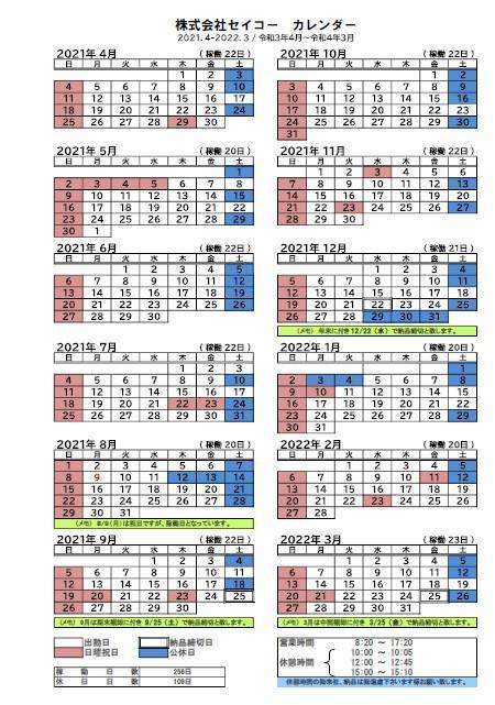 夏季休暇期間の日程に変更がございましたので セイコー営業カレンダー【改訂版】を掲載いたします。 ご利用下さい。 セイコーカレンダー R2-3年 改訂版